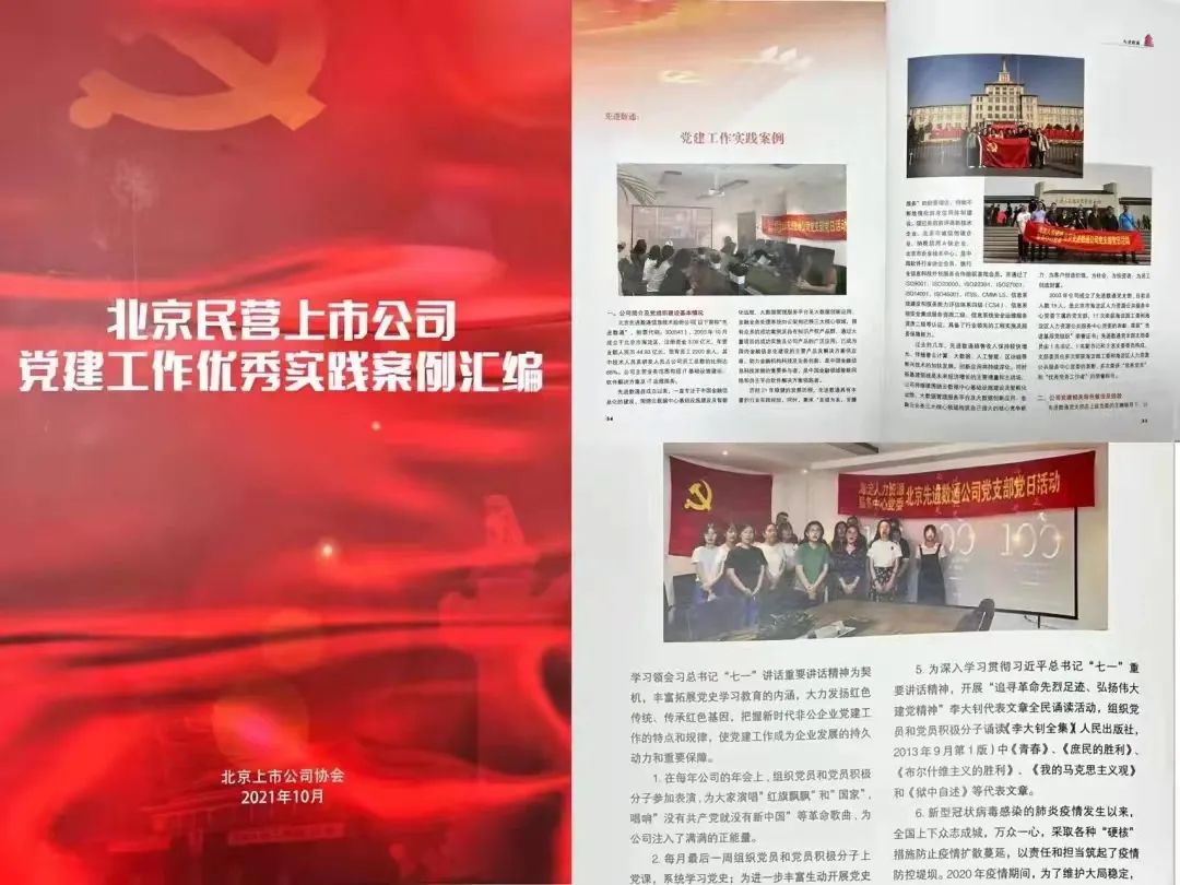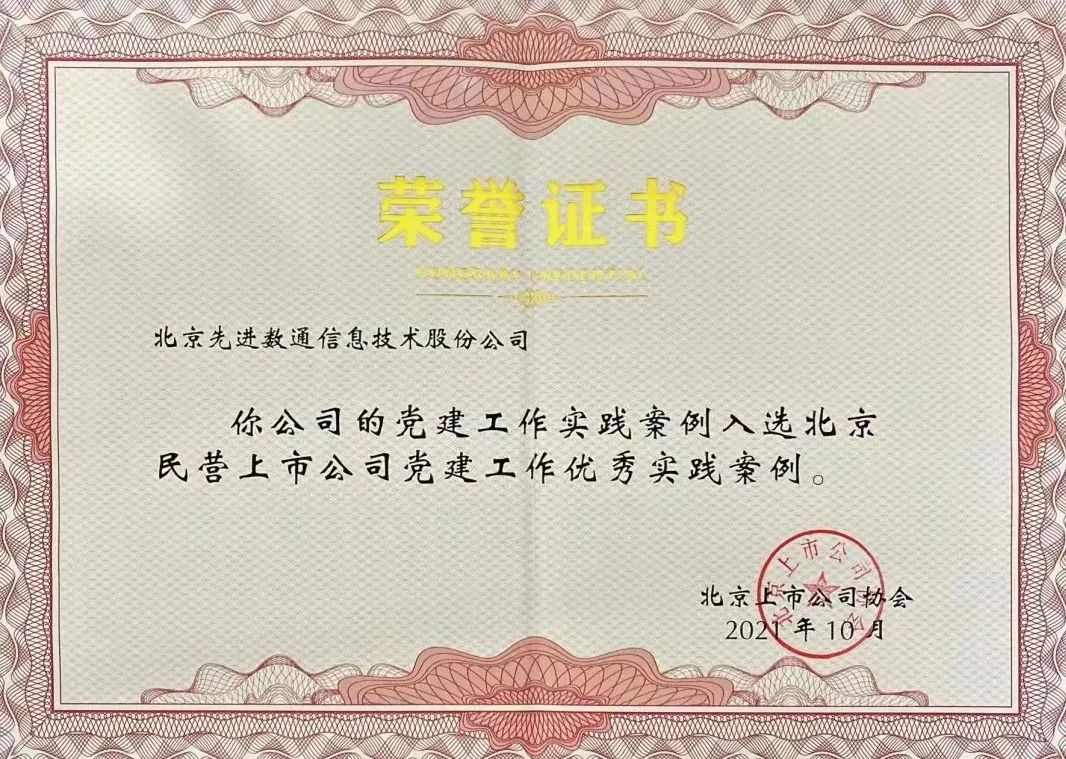 近期,北京上市公司协会授予北京尊龙凯时z6com信息技术股份公司荣誉证书,尊龙凯时z6com党建工作实践入选北京民营上市公司党建工作优秀实践案例,相关党建活动已收录在《北京民营上市公司党建工作优秀实践案例汇编》。