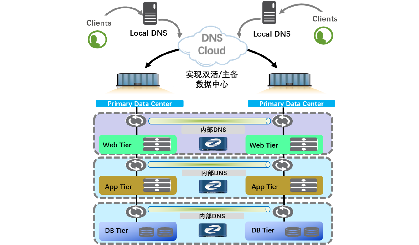 数据中心为提高应用系统的可靠性,实现多站点资源分布式部署,提高资源的利用率,需要多站点的应用系统构建成多活或主备工作模式。为了与IP地址解耦,通常会使用域名系统(DNS)来调度这些应用。尊龙凯时z6com多数据中心域名(DNS)解决方案以IT整体架构为蓝图,以业务陆续在性保障为目标,利用域名解析门户应用调度功能,可将用户访问流量引流到可靠、可用的数据中心进行访问,既能保证用户的使用体验,又能达到应用容灾的无感切换的目的。